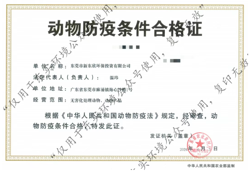 目前东实环境下属企业东莞市新东欣环保投资有限公司作为全市唯一具备《动物防疫条件合格证》的无害化处置单位,协同东莞市新东泰物流有限公司建立了“有科技、有温度、有保障”的无害化处置体系,打通“动物诊疗机构+宠物善终服务联络点”的标准化网络,构建起“政府监管、企业运作、市民共建”的处置闭环,为东莞市内离世的毛孩子提供告别之旅,并画上了温暖的句点。 “正规处置”从此成为东莞养宠家庭的常态选择,目前我们已为东莞市上3000只毛孩子完成了暖心的无害化处置,市民对死亡宠物处置流程的合法性和规范性表示赞赏,均称赞东莞市是个有温度的城市。
